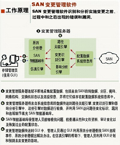 变更管理软件可在整个变更、发展、迁移和合并过程中监控SAN。当有问题发生时,会通过电子邮件、SNMP(简单网络管理协议)和GUI通知管理人员并向其发送一份原因解释和解决方案的邮件。在问题会影响应用程序的可用性之前,警报会让管理人员把问题解决掉。