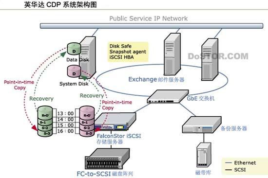系统快速恢复解决方案(CDP)结合了点时间的快照技术(Point-in-Time Snapshot)和iSCSI两项技术,架构上并不复杂,整套方案的核心是1台装有飞康公司 iSCSI 存储服务器(???QISS)的Windows Storage Server 2003存储服务器,前端通过GbE网络和Exchange服务器连接,后端则是利用SCSI适配器连接2TB容量的磁盘阵列。