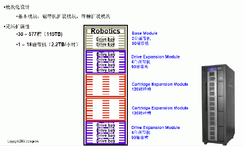 StreamLine模块化磁带库系统秉承了StorageTek磁带库一贯的卓越品质,其中SL500以合理的价格、良好的可扩展性以及较低的管理成本成为中低端用户值得信赖的产品。拥有SL500,用户可以随着业务的增长来扩充存储容量,从初期的30个LTO磁带槽可一直增加到577个槽位,StreamLine SL500的模块化设计令企业可以从一个满足当前存储需求的有成本效益的配置起步,在必要时添加存储模块来满足增加的存储需求,而不会增加管理复杂性或降低系统可靠性。