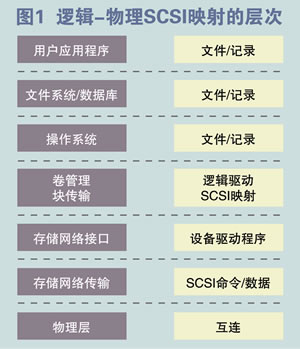 如图一所示,逻辑抽象的层次从实际的物理SCSI设备一直到同主机系统的连接。在操作系统层次,一般的访问方法允许对SCSI设备进行统一的处理,而不考虑它们在系统中的物理连接。在保存文件时,文件系统并不关心逻辑驱动器是一个SCSI单元、一个Fibre Channel阵列还是千兆以太网的某个IP存储设备。在各种情况下,逻辑实体和物理存储的映射完成主机系统和合适的目标SCSI命令的发送,它在二者之间用来传输数据块。