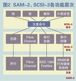 SCSI-3标准家族引进了几种新的SCSI命令变体,其中包括串行SCSI-3和在磁带中进行数据流和介质处理所需要的特殊命令组。如图二所示,命令层独立于协议层,协议层用来在设备之间传送SCSI-3命令。这使得取代SCSI-3同操作系统之间的命令接口下的不同传输更具有灵活性。例如,在视频编辑系统中,外部设备可以使用IEEE 1394 FireWire处理高速但是有距离限制的SCSI-3串行总线事务。