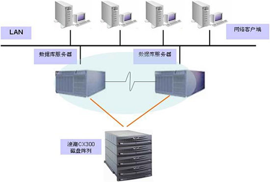 共享磁盘阵列双机高可用方案采用的存储设备是浪潮EMC CX300,通过光纤通道与服务器上HBA卡连接,通过使用LCHA软件,结合基于IA架构技术的浪潮服务器系统,以及存储系统搭建双机系统,用户可以用较少的费用使系统达到高端服务器或小型机的高稳定性和容错能力,整个系统具有较高的性价比。