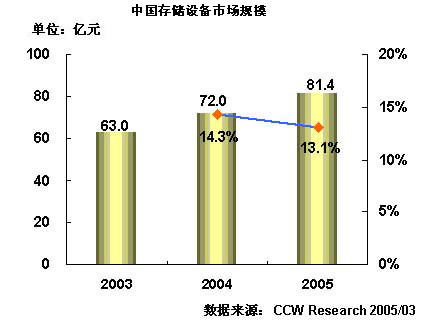 在中小企业、电信、制造、政府和媒体等行业用户采购的拉动下,2004年中国存储设备市场增长迅速,市场规模达到72亿元,比2003年增长14.3%。