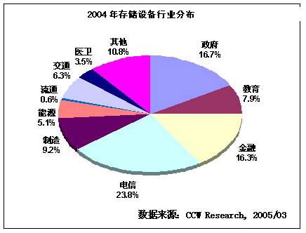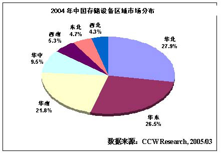 从区域分布看,由于区域经济发展和信息化建设水平的不平衡,2004年华北、华东和华南三个经济最为发达、信息化水平最高的地区,仍然是存储产品主要的市场。