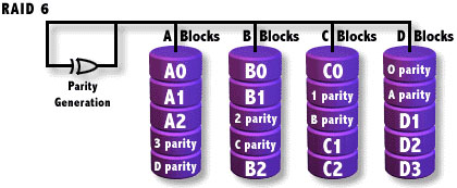 NEC的S2400/S1400存储产品中都采用RAID 6的技术,RAID6是一种双维奇偶校验独立存取的磁盘阵列。它的冗余的检、纠错信息均匀分布在所有磁盘上,而数据仍以大小可变的块以交叉方式存于各盘,这类盘阵列可容许双盘出错。RAID 6等级是在RAID 5基础上,为了进一步加强数据保护而设计的一种RAID方式,实际上是一种扩展RAID 5等级。与RAID 5的不同之处于除了每个硬盘上都有同级数据XOR校验区外,还有一个针对每个数据块的XOR校验区。当然,当前盘数据块的校验数据不可能存在当前盘而是交错存储的,具体形式见下图。