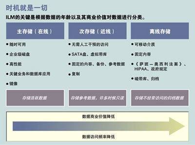 根据ILM的出发点,ILM是各种过程、策略和技术的融合,这三者将根据用户的策略对信息进行分类,把这些信息存储在一个层次分明的体系结构之中,然后根据这些信息的价值、业务流程需求、用户访问需求以及保留/删除要求,在各层次之间透明地移动。如果部署得当,ILM系统将确保从信息生成到被删除期间,信息随着其价值的变化,在正确的时间移动至正确的地方。