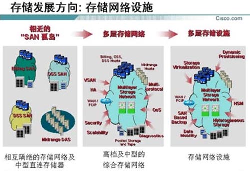 和其他领先技术一样,存储网络市场也会得益于Cisco 所热切推动的现有技术和创新技术的发展与融合。另一方面,提高了的物理上的连通性,并没有本质上改变在多个服务器之间共享数据的困难。所以多层智能化存储网络为嵌入各种智能化存储服务(例如基于网络的虚拟化和复制)提供一个开放的平台。多层智能化存储网络用一种层次化的方式来实现网络和存储智能,为存储网络的发展开辟了一个新的纪元(图3-4)。