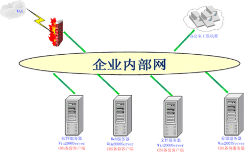 秦皇岛首钢板材有限公司主要有一台非常重要的 Web 服务器、邮件服务器和一台文件服务器、以及建立在此基础之上的业务、办公等应用系统,每天产生大量数据,信息量每年以大于 10% 的速率递增。要求 24 小时不间断运行,一旦系统崩溃,应在最短时间内恢复系统和数据。因此,当前要求备份系统对这三台重要服务器进行在线备份,这三台服务器的运行平台都是 Windows2000Server ,并将这三台服务器的所有资料都备份到另一台运行平台为 Windows2003Server 服务器上。
