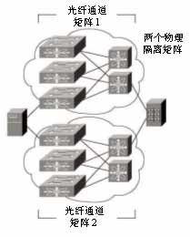 高可用性—-企业最常采用的方法是建立多个并行矩阵,然后将主机和磁盘放置到这些物理隔离的并列矩阵中。一般情况下,实施隔离的主要原因是将名称服务等网络服务限制在单个矩阵内。这样,当某个矩阵中的服务失败时,将不会影响到其它并行矩阵。因此,并行矩阵能够提供从主机到磁盘的隔离路径。