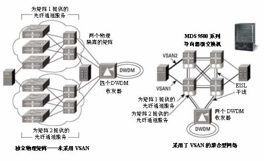 另外,利用VSAN还可以通过长途基础设施将远程数据中心里的隔离网络连接在一起。由于帧标记在硬件中执行,并包含在每个EISL帧中,因而可以通过多种介质传输,例如密集波分多路复用(DWDM)或粗波分多路复用(CWDM)等。因此,来自多个VSAN的流量可以通过同一对光纤多路传输,不但增加了传输距离,还能保持完全隔离。由于VSAN能够利用通用冗余物理基础设施建立灵活的隔离矩阵,因而大大提高了可扩展性,并最终实现了高可用性目标。