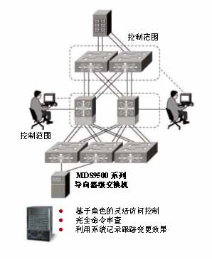 安全性一般不与高可用性一起考虑。但是,人工错误是引起停机的主要原因之一。用户可能没有意识到某项命令的结果就错误地了执行了这个命令。Cisco MDS 9000系列多层导向器和矩阵交换机支持基于角色的安全方法,以保证只有合法个人才能访问网络内的主要功能。管理员将为每个用户指定一个角色,用group_ID表示,用以说明在网络内的特定访问权限。这种访问权限规定了可以执行的命令,即某个权限可以访问命令行界面(CLI)命令解析器树的哪些节点。例如,管理员可以规定一个称为“no_debug”的角色,这个角色可以执行debug命令以外的任何命令。这种许可系统可以精确地解析器树中的第2个级别,因此,管理员甚至可以规定一个称为“no_debug_fspf”的角色,这个角色允许用户执行任何系统命令,包括debug命令,但FSPF debug命令除外。角色可以利用CLI命令在交换机内规定和分配。为简化管理,还可以在Radius服务器中集中分配角色。系统提供两个默认角色,称为网络管理员(完全访问)和网络操作员(只读访问)。用户最多可以规定64个具体角色。只有担当网络管理员角色的用户才能创建新角色。