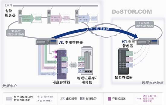 为了达到磁带搬运的目的,VTL 可以将数据复制到远程站点,在这些站点上可以将数据存储到基于磁盘的虚拟磁带,也可以将这些数据导出到物理磁带。这种复制处理效率很高,因为它独立于生产服务器并使用节约带宽、基于增量的算法,通过 IP 跨越任意距离,将数据复制到异地远程位置。