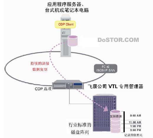 VTL 基于磁盘的备份模式使 CDP 可以持续的复制并记录传入的信息,提供无数已知的好的时间点。生成的副本包含处于稳定状态的应用程序、数据库和电子邮件数据,允许用户根据需要快速恢复关键业务数据。CDP 也扩展了飞康公司的 VTL的 快速数据恢复功能的综合范围,包括通过 iSCSI、光纤通道 HBA 或 PXE 进行远程启动恢复以及通过恢复光盘对整个系统进行复原。