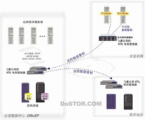 飞康公司的 VTL 是针对远程办公地点备份的经济高效的解决方案。它简化、整合分散在远程办公地点的数据备份到一个集中的数据中心,实施整个企业范围的数据保护。飞康公司的 VTL 允许远程备份服务器通过 IP 访问虚拟磁带机/带库,同时使得这些服务器可以使用中央数据中心的备份设备。VTL 提供的异地备份功能使得不必在每个场所都进行备份存储,并对远程办公地点提供了另外的数据保护。另外,由于是集中备份,所以可以方便地管理并对整个企业的数据进行可靠归档。