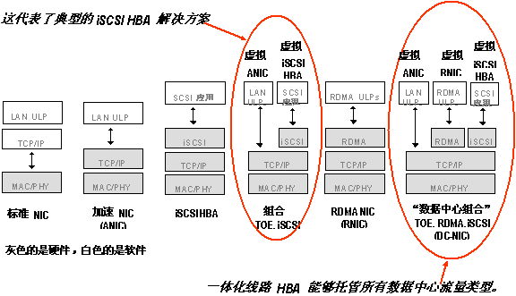 今天,有几家厂商可以提供 iSCSI HBA。2005 年初,市场上将出现第一款组合的一体化线路 HBA 和 ASIC。这种情况下,随着不同方法的讨论和测试,解决方案的灵活性将变得至关重要。上面的体系结构图中引入了 RDMA。利用 RDMA(远程数据存储器存取),可直接将数据放入应用的缓冲器中,从而消除 RDMA 数据传输要求的多个数据复本。IETF 正在讨论的、在 RDMA 上处理所有流量的方法会引起人们的兴趣吗?或者,用于文件流量(非数据块流量)的 RDMA 会胜出?只有时间才能回答这个问题。这里还有一个颇具争议的说法–只有传统的大型光纤通道 SAN 才会将 10G 光纤通道将 转移到 ISL。8G 光纤通道链路可能是最后一个光纤通道高速主机连接。10G 主机连接可能只用于以太网领域。