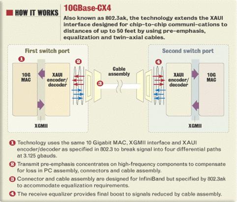 工作原理 10GBase?DCX4:与我们已知的802.3ak一样,10GBase?DCX4技术扩展了XAUI接口,它使用预加重,均值化和双轴电缆,设计用于在长达50英尺距离内进行芯片到芯片的通信。