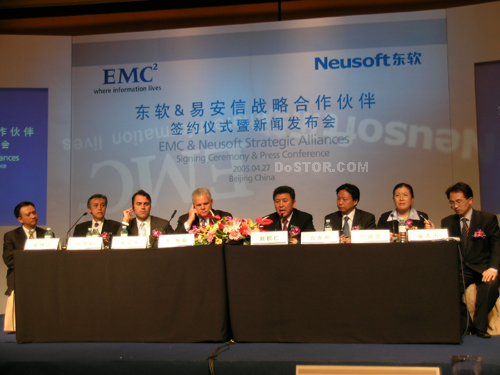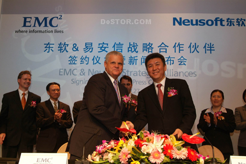 存储在线 4月27日北京消息:美国易安信(EMC)公司与中国领先的软件与解决方案提供商东软集团今天在北京联合召开了“东软&易安信战略合作伙伴签约仪式暨新闻发布会”,宣布双方将结成战略合作伙伴关系,通过强强联合,共同提升在中国的信息管理与服务市场,为客户提供更加优化的产品与解决方案。美国易安信(EMC)公司总裁兼首席执行官乔•图斯先生、东软集团董事长兼CEO刘积仁博士以及双方高级管理团队一同出席了此次的战略合作签约仪式。根据此次所签署的协议,易安信(EMC)将在东软集团总部建立EMC研发中心,并在解决方案研发、教育与培训、市场与服务以及医疗领域与东软集团展开全方位的合作。