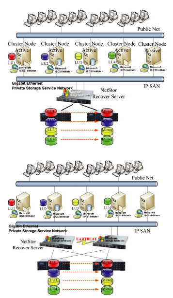 NetStor Storage Server for Cluster Application本身也可以支持Cluster技术,两台NetStor Storage Server for Cluster Application可以通过构建Cluster系统来确保硬件上的完全可用性;任何一台NetStor Storage Server for Cluster Application出现故障无法对应用服务器提供iSCSI磁盘服务时,另外一台NetStor Storage Server for Cluster Application会自动接管故障NetStor Storage Server for Cluster Application的iSCSI磁盘服务,保证服务器对于磁盘I/O的可靠性!