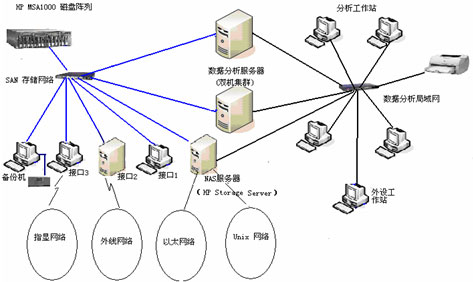 根据用户的需求,HP设计了SAN+NAS存储解决方案,该系统由1台NAS文件转换服务器(HP Storage Server DL380G4)、2台数据分析服务器(双机集群)、3台接口工作站(其中接口1个接口3采用HP XW4100工作站,接口2采用HP ML350G4服务器)与1台HP 8口光纤通道交换机和1台HP MSA1000光纤磁盘阵列组成SAN架构存储体系。每台工作站和服务器均安装有1块存储光纤通道卡通过交换机连接到MSA1000存储,最终实现各工作站和服务器的数据集中存入到光纤阵列中,进行统一的管理和存储。该方案采用了HP FCA存储光纤交换机、HP MSA1000光纤磁盘阵列、HP Storage Server DL380G4、 VERITAS备份和集群软件。