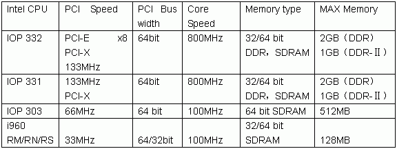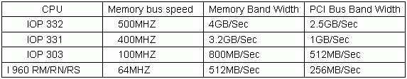 - I/O Processor最常用Intel CPU,将此IOP规格Memory Bus,PCI Bus频宽列于下面图表,以供了解这些不同的CPU的执行效能。