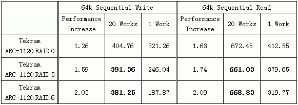 - Performance提升的比例以RAID 6最大,20Works时为1Work的2倍,符合RAID 6在多任务环境的实际应用需求。