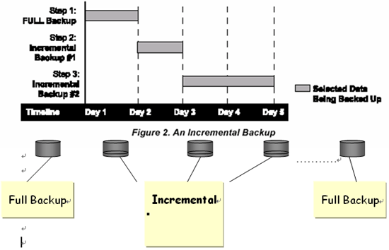 2、 增量备份。(Incremental Backups)增量备份指备份上一次正常或增量备份后,创建或改变的文件。备份后标记文件(换言之,清除存档属性)。如果使用正常和增量备份的组合,您需要具有上一次普通备份集和所有增量备份集,以便还原数据。