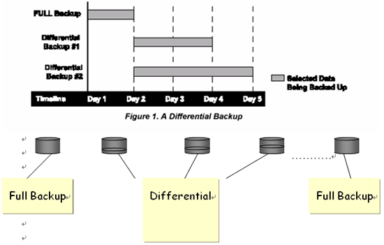 注:差异备份,是指在一次全备份后,每次差异备份是备份从一次全备份或增量备份到每次进行差异备份这段时间的文件增加或者文件被修改后的备份。恢复时只需恢复第一次全备份和最后一次差异备份。