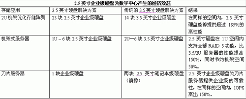 正如表1列出的那样,2.5英寸硬盘的好处并不仅仅局限于存储阵列。目前的1U服务器和刀片服务器正推动一场新的成本节约运动;为这些经济型服务器安装2.5英寸硬盘,将大幅提高它们满足范围广泛的企业应用的能力。
