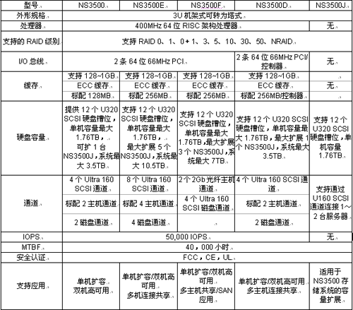 - NS3500:标配为单控制器、双SCSI主机通道的磁盘阵列产品。64位RISC架构处理器,ECC缓存,标配128MB,最大支持1GB。3U紧凑机架式设计,单机最大12个硬盘槽位,单机最大1.76TB,系统最大3.5TB。更可根据客户需求变更为:多通道配置NS3500E、双控制器配置NS3500D和光纤主机通道配置NS3500F。