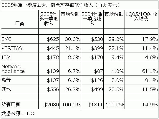 2005年第一季度EMC以30.0%的收入份额在整个市场领先。VERITAS以21.4%的收入份额保持第二,同比增长11.4%。IBM以8.6%的收入份额名列第三。Network Appliance和惠普并列跻身前五名,收入份额分别为6.7%和6.6%。Network Appliance和EMC在前五大厂商中增长最快,同比分别增长61.1%和17.9%。