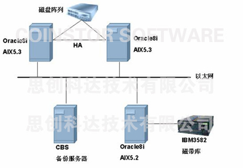 武汉中百连锁仓储超市有限公司 目前需要备份的系统主要是三台 Oracle8i 数据库,其中两台是做了 HA ,操作平台是 AIX5.3 ,另一台的操作平台是 AIX5.2 ,数据库大小有 500 多 G 。所有需要备份的系统和 CBS 备份服务器通过 LAN 相互连接。 武汉中百连锁仓储超市有限公司具体的备份需求为: