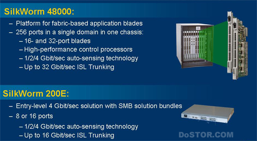新款SilkWorm 48000光纤导向器支持4Gbps光纤信道技术,端口数量增加到了256个,这是SilkWorm 24000系列的两倍。另一款4Gbps的交换机产品是240E,它属于入门级产品,端口数量为8个,每次增加4个端口,最多可扩展至16个。据悉,这两款产品目前都已经交由OEM进行认证测试。