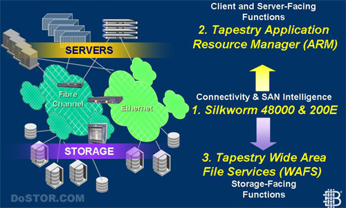 Tapestry ARM是博科在收购Rhapsody和Therion之后,向用户呈现的第一款产品。Tapestry ARM整合了Rhapsody的智能化交换平台AP7420的技术和Therion的共享存储和动态系统管理技术。该产品最大的特点就在于:促使交换机结合计算机系统和存储设备的实际需求来协调操作系统影像和应用程序的资源配置。