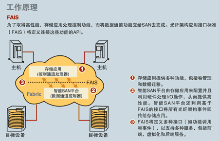 为了保证平滑部署智能SAN基础设施,ANSI T11委员会T11.5任务组建立了一个工作小组,来定义在存储管理应用和智能SAN平台中实现的控制通道与数据通道功能之间的标准API。光纤架构应用接口标准(Fabric Application Interface Standard,FAIS)将加快产品开发速度,为用户提供更多的选择。
