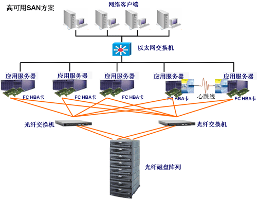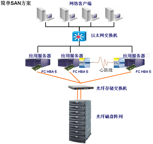 –本方案主要解决简单SAN的存储路径存在单点故障隐患的问题。通过配置2台以上的交换机及在服务器中安装2块HBA卡,可以使每台服务器都有至少2条路径可以访问存储设备。这样,无论是HBA卡、光纤线缆还是交换机任何1点出现故障都不会影响服务器对存储设备中数据的访问。路径故障的监控和切换都统一由安装在服务器上路径冗余软件来管理。