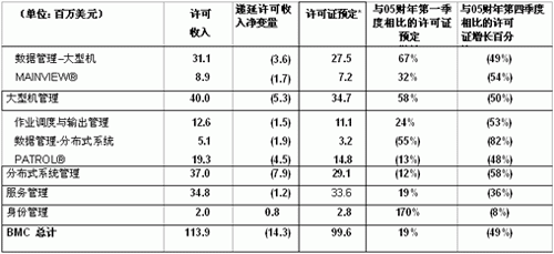 除去特殊项目,按非美国公认会计准则(Non-GAAP)计算,BMC 软件公司2006财年第一季度净收益为4390万美元,含28%税金,稀释后普通股每股净收益为0.20美元,同比增长39%。2006财年第一季度每股收益普遍预期为0.13美元。按 GAAP 计算,2006财年第一季度净亏损4110万美元,每股收益亏损0.19美元。造成非 GAAP 与 GAAP 每股收益计算差别的主要原因是外来外汇收入每股上缴税金约0.17美元,以及公司重组的费用每股0.14美元。财务报表内包括非 GAAP 与GAAP 统计的调节结果。