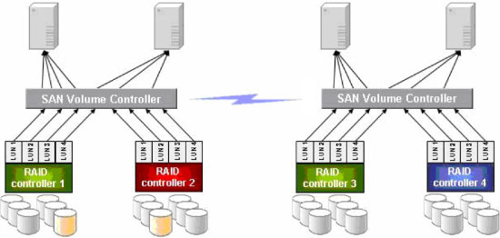 在所有需要容灾的系统SAN 网络种加入SVC,然后就可以利用SVC 的远程复制功能进行数据容灾了。