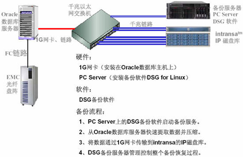中国电信运营商市场,是一个数据容量极大、数据处理实时性极强、数据安全性及业务连续性要求极高的关键性应用场合,Intransa与北京瑞斯康达科技发展有限公司相配合,将其IP磁盘技术与DSG备份软件相结合,在陕西联通信息中心实现了基于IP磁盘库的数据备份系统。系统连接图如下所示: