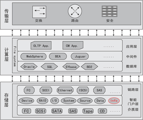 智能门户层也叫信息交换层,是存储系统的核心,主要实现对数据存储层的各种管理,为IT系统的数据存储提供各种存储功能,其管理功能层级从低到高可以划分为:Device–设备管理,RAID管理、I/O管理、System–存储系统管理、Resource–存储资源管理、Data–数据管理、Info–信息管理。最终,活性存储产品在实现所有层级功能的基础上,通过植入Info–信息管理功能,真正实现对信息的交换和整合。