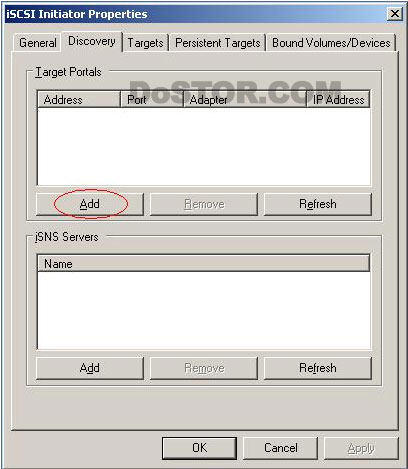 先点选配置界面中“Discovery”配置页。并点击Target Portals框下方的“Add”按钮。