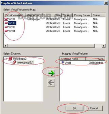 在弹出的窗口中,选中刚刚创建的虚拟卷和远端iSCSI通道,单击向右按钮。这样就建立了该虚拟卷和该iSCSI通道的连接映射。