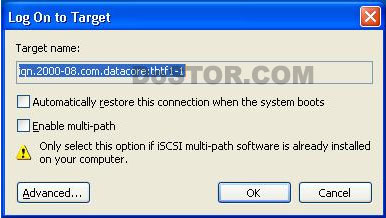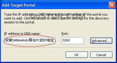 在弹出的对话框里填入另外一台PC(就是安装DataCore SANmelody的那台)IP地址,然后点“OK”关闭对话框。我个人还喜欢到“Advanced…”选项中,把“Local adapter”和“Source IP”的设置由“Default”改为“Microsoft iSCSI Initiator”和本机IP。不过一般情况下,不改这些设置也不影响正常连接。