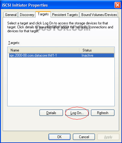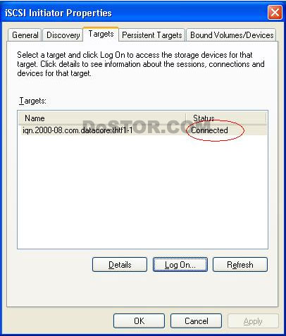 如果地址正确,两主机通讯正常,在Target Portals框里,就会出现SANmelody那台PC的信息。这时就可以向iSCSI Target登陆了。