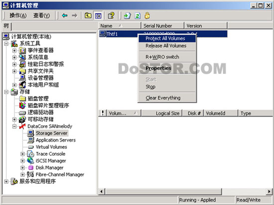 启动服务之后,我们要将刚刚创建的空间纳入SANmelody的管理。操作步骤是右键单击右上角框中本主机的名字,选择“Protect All Volumes”。