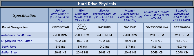 为了准备地反映出此款硬盘的具体性能,我们选取了位于同一档次的六款硬盘进行对比评测,这六款硬盘的物理特性见下图所示: