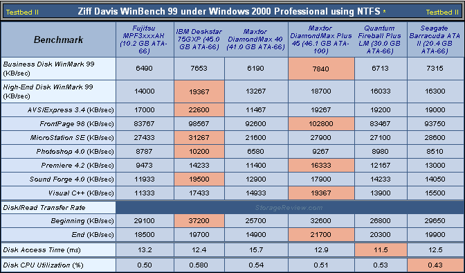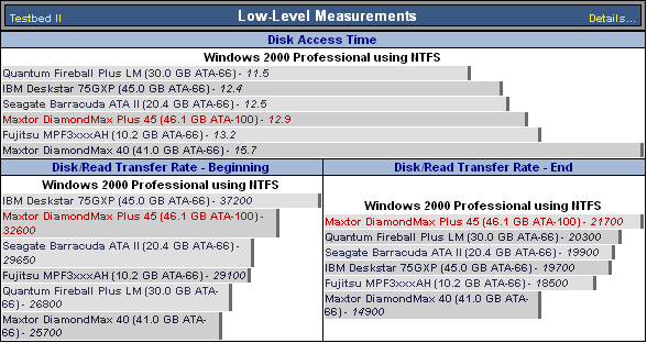 DiamondMax Plus 45 在商业测试中取得了 7.84 MB/sec 的成绩,是到目前为止 ATA 硬盘的最好成绩,比之前 IBM Deskstar 75GXP 所保持的最好成绩提高了 2%。在高端应用方面,DiamondMax Plus 45 的成绩为 18.7 MB/sec,仅次于 Deskstar 75GXP ,排名第二。