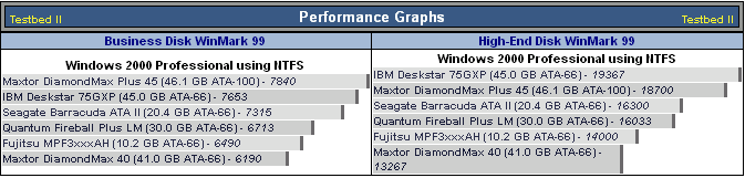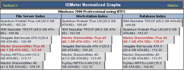 在性能方面,DiamondMax Plus 45有了较大的改进,但是还是难以撼动 Deskstar 75GXP 的领先地位。不过,迈拓硬盘在价格上具有一定的优势,因此,如果用户希望购买一块价格比Deskstar 75GXP 低,容量比 Fireball Plus LM 大的高性能硬盘的话,可以考虑 DiamondMax Plus 45。