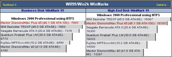 虽然 DiamondMax Plus 45 在访问时间方面有了很大的改进,但是当硬盘负载逐渐加大时,DiamondMax Plus 45 与其它高性能硬盘,例如 IBM Deskstar 75GXP 以及 Quantum Fireball Plus LM 等的差距就逐渐拉大了。其中,在工作站测试一项中,DiamondMax Plus 45 落后 Quantum Fireball Plus LM 将近15%。看来,迈拓还需要在硬盘固件和缓存算法方面进行改进以适应更高的负载。