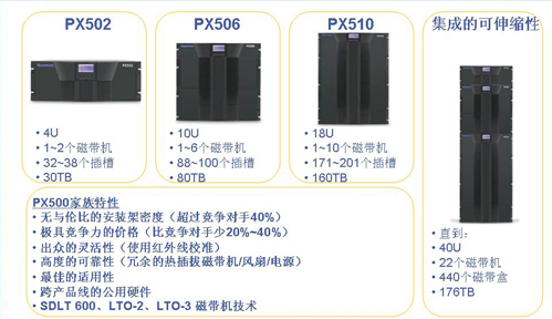 PX500系列—-包括PX502、PX506和PX510,提供了4U、10U和18U(机架单位)的独立机架式系统,满足客户从工作组到数据中心的关键业务数据需求。该系统基于一个通用和模块化的架构,允许客户灵活地混合和调节机架密度、功能和性能,从而以无与伦比的千兆成本来满足客户当前和未来备份、恢复和存档的需要。