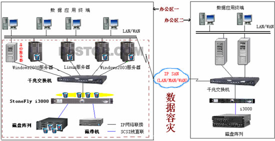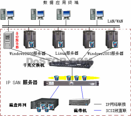 先进的IP SAN 结构:系统从网络结构上是一个典型的SAN 存储架构,它是在传统的SAN结构中,以IP 协议替代光纤通道协议,来构建结构上与LAN 隔离,而技术上与LAN 一致的新型SAN 系统–IP SAN。